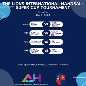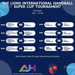 In perioada 27.08-30.08.2025, va avea loc ,,The Lions International Handball Super Cup Tournament” desfasurat in sala de sport Sârbi, Farcasa, unde juniorii 3 ai Academia de Handbal Minaur Baia Mare vor fi prezenti alaturi de urmatoarele echipe: